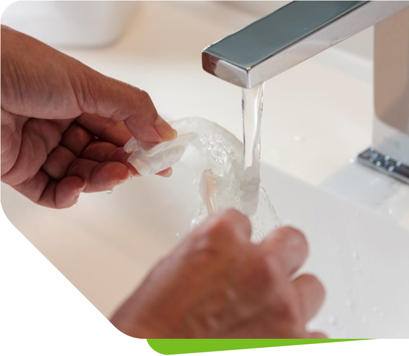 • Reinig uw MRA met een zachte tandenborstel en een mild reinigingsmiddel, zoals (antibacteriële) handzeep. Gebruik geen tandpasta, reinigingsmiddelen voor protheses, mondspoelmiddelen of bleekwateroplossingen.